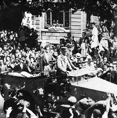 La fotografía fue tomada el 25 de agosto de 1944, el día de la liberación de Paris. La imagen muestra a un grupo de hombres sobre un blindado recorriendo una calle de la ciudad luz en el fragor de los últimos combates para liberarla de la ocupación nazi. En primer plano sobre la plataforma se encuentra el general Philippe Leclerc, conde de Hauteclocque (1902 –1947), comandante de la 9a división de las tropas aliadas y cabeza visible del ejército de las fuerzas de la Francia libre durante la Segunda Guerra Mundial. En segundo lugar, sentado, se encuentra el temible general nazi Dietrich von Choltitz, jefe de la guarnición de París, quien se había rendido horas antes. Detrás de él, de pie, se encuentra un joven de pelo ensortijado y lentes redondos cuyo nombre era Maurice Kriegel, alias “Valrimont” (1914-2006), comandante del Comité d’action militaire (Comac), brazo armado del Mouvements unis de la Résistance (MUR).