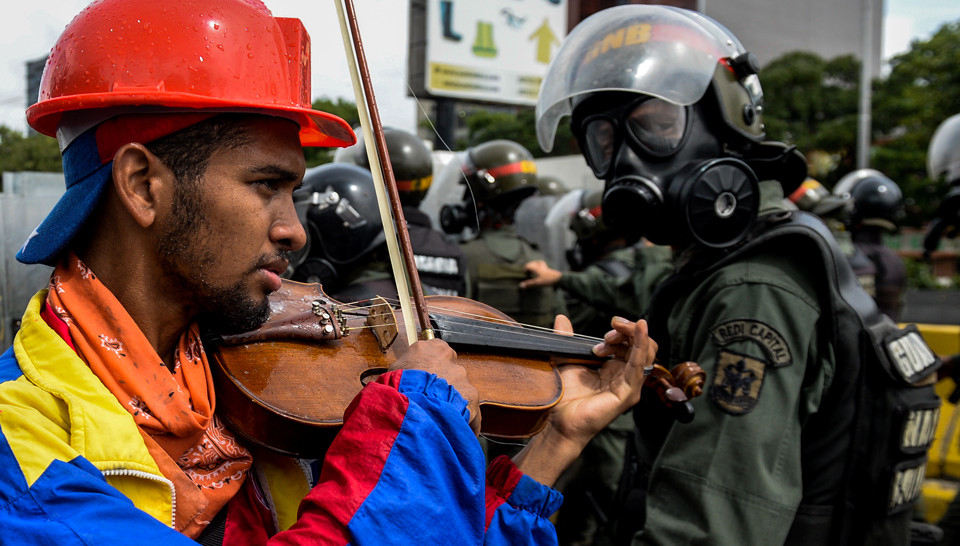 Wuilly Moises Arteaga, el joven violinista de las barricadas, fue apresado por la GNB durante una manifestación en Caracas. Además de haber permanecido aislado, le quemaron su cabello y lo golpearon fuertemente en la cabeza y rostro, lo que hizo que perdiera la audición del oído derecho. Wuilly fue trasladado al Palacio de Justicia de Caracas y fue presentado ante un tribunal que determinó que continuará detenido, ya que al músico le imputan los delitos de “instigación pública y detentación de sustancias incendiarias”. No es la primera vez que arremeten contra él. En otra oportunidad fue sometido a una brutal golpiza y despojado de su violín para ser destruido, aplastado por las botas de los militares y paramilitares asesinos que reprimen las manifestaciones pacíficas que claman por democracia en Venezuela. Hasta aquí las noticias que circulan en las redes.