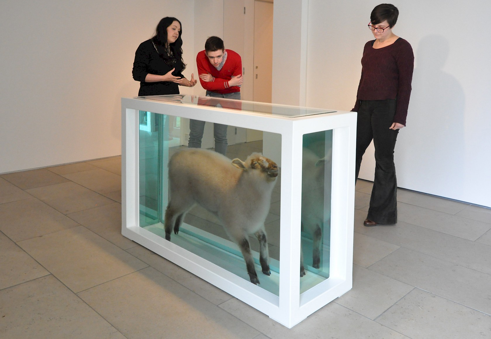 En 2012, ante el temor de que la carencia de un discurso y la extravagancia de esas obras pudieran adquirir un carácter efímero, dos destacados coleccionistas que habían invertido en ellas, influyeron para que el Tate Modern de Londres organizara una exposición retrospectiva, intuyendo que en el contexto de un museo con tanto prestigio, se comenzaran a valorar esos objetos como obras de arte. Sin embargo, eso no pudo detener la caída de su valor en el mercado. Pero recordemos lo exhibido en dicha retrospectiva, curada por Ann Gallagher: Boxes(1988) composiciones en las que cajas de cartón coloreadas conforman diseños en los muros a lo Mondrian; Spots Painting(1986), lunares de colores sobre lienzos, que vendrían a ser una ampliación de la trama que uno puede ver a través de un cuenta hilos de imprenta …ya visto en los años 60’s en el Pop Art norteamericano; 8 Pans(1987), ocho ollas y sartenes coloreados con pintura acrílica. En el centro de la sala No 2, se encontraba Mil años(1990) una estructura de vidrio aislante en cuyo interior estaba la cabeza decapitada de un becerro pudriéndose en tiempo real con miles de moscas revoloteando sobre la carroña mientras que en lo alto estaba colocada la parrilla de un matamoscas eléctrico donde se electrocutaban docenas de éstas. En las otras salas fueron instalados corderos y vacas (Mother and Child, 1990) cortados por la mitad y conservados en formol, mariposas en libre vuelo, materiales didácticos para la enseñanza de la medicina, el interior de una farmacia, así como todo un instrumental quirúrgico exhibido en vitrinas. En fin, cualquier cosa dentro de una serie de despropósitos de una curadora y un artista que no tenía un discurso sólido que mostrar. El Tate convertido en morgue o en laboratorio de taxidermia.