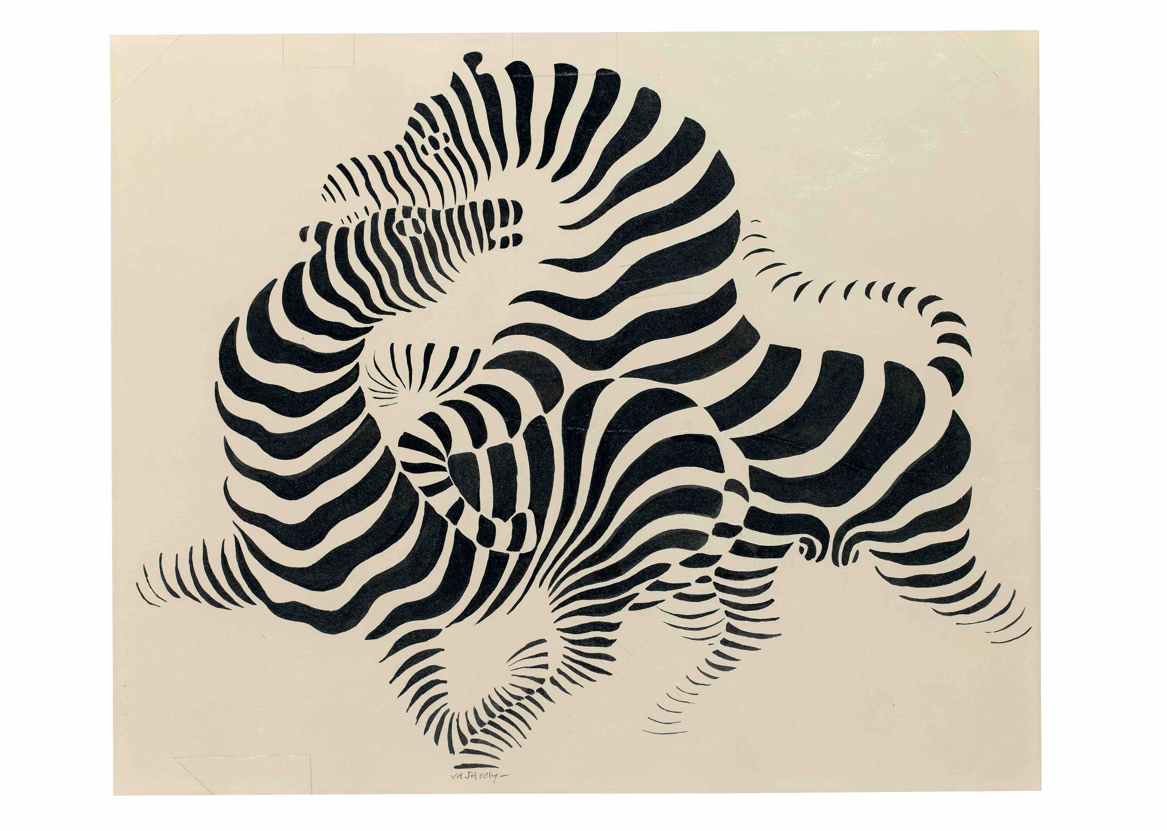 En sus trabajos que realizó antes de 1945, descubrimos al diseñador gráfico, al apreciar en una de las salas, entre otros proyectos, el logo de Renault de su autoría. En el tránsito por la sección de sus “estudios plásticos” de 1930, observamos la serie “Zebras”, que anuncia las desestabilizaciones del plano, a todas luces un precedente del período cinético. “Si Vasarely es heredero de la tradición constructivista, su arte incurre en la perversión de renunciar a un uso literal de las formas, escenificando mediante diversos métodos ilusionistas, las trampas de la visión”, expresan Gauthier y Pierre. En las obras en las que utiliza contrastes en blanco y negro, genera fenómenos ópticos que proyectan inestabilidad y movilidad. Estos experimentos visuales trazaron los pasos iniciales de la tendencia Op-Art.