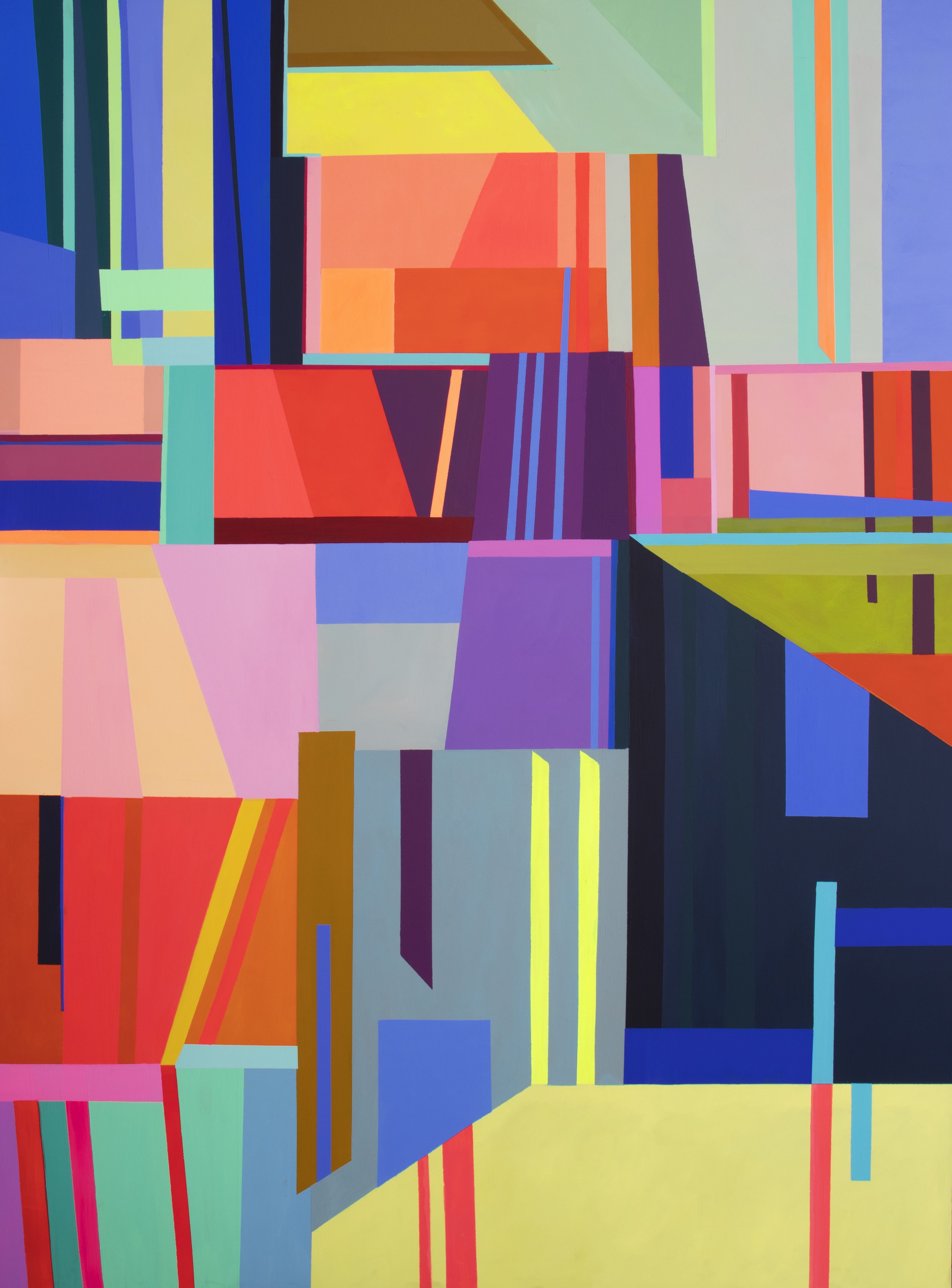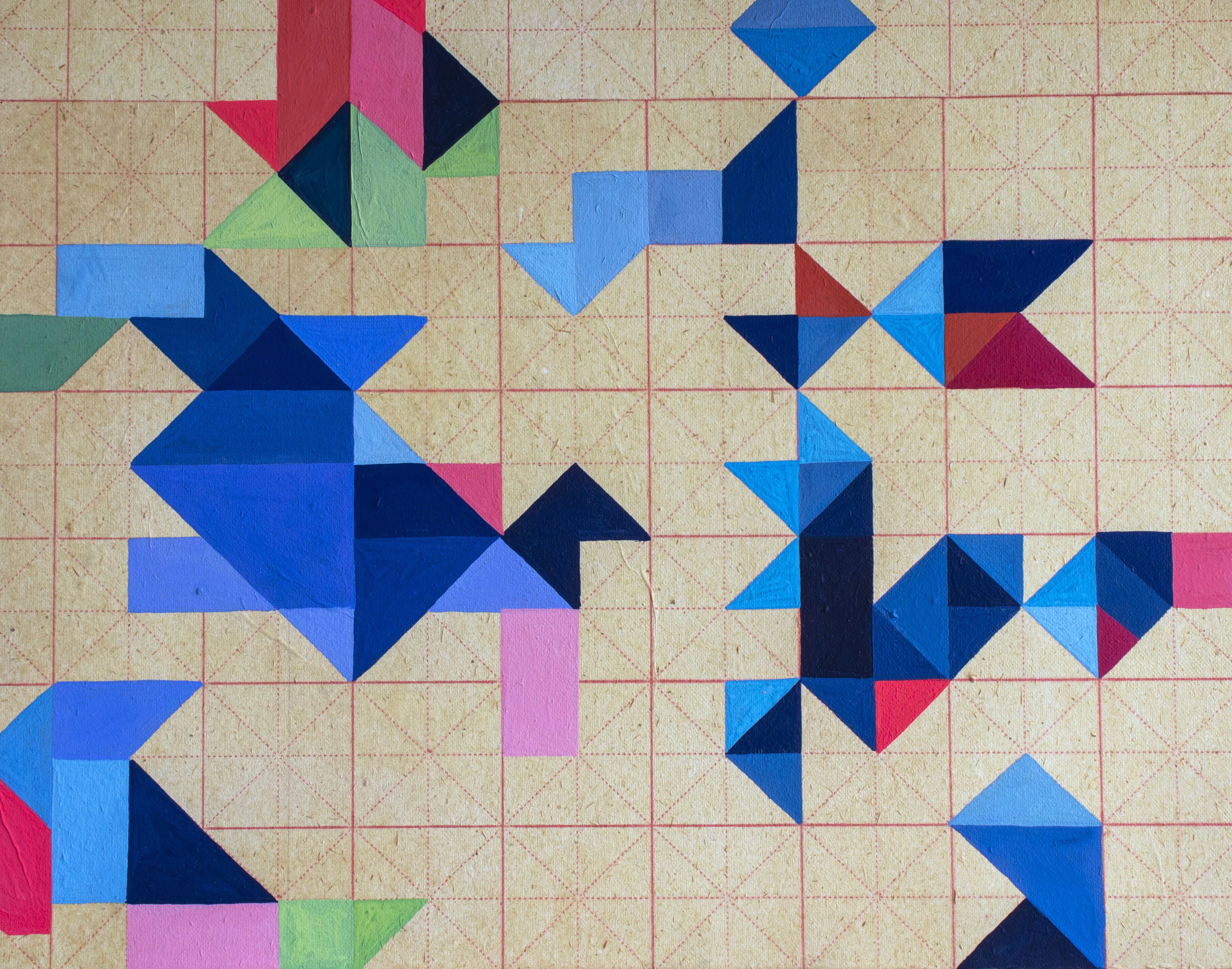 Cito a Herbin, ya que la artista Carolina Guillermet, en el proceso de construcción de su discurso, expresa que “utiliza el color y la forma para construir un vocabulario abstracto, cuyos efectos sugieren una especie de ‘arquitectura emocional’, tanto espacial como sensorial, que se relaciona con la interacción de patrones y ritmos para extraer diferentes percepciones de luz, volumen, e incluso provocar respuestas sinestésicas a través de sus combinaciones”. Eso es lo que propone en sus pinturas, elaboradas con superficies y colores. De esa manera, los elementos geométricos crean tensiones, ya que los colores planos crean efectos cromáticos de espacio y vibración, las composiciones geométricas forman estructuras que recuerdan construcciones o formas arquitectónicas. “Creo en la construcción meditativa de lo visible y, en el planteamiento del color, veo una posibilidad de jugar con afectos que no son coartadas por un exceso de racionalidad”, expresa la artista cuando se propone modificar la percepción de los colores mediante los contrastes que interactúan en sus diseños. Los valores cromáticos y estructurales de su abstracción geométrica son los recursos que utiliza para crear un lenguaje autónomo con el que comunica sus percepciones.