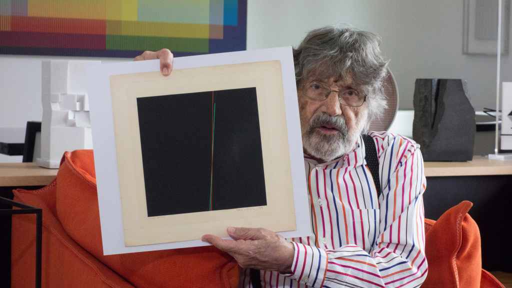 Carlos Cruz-Diez, mostrando sus primeros experimentos de Amarillo Aditivo (1959). © Articruz Panama, 2015 / Photo: Rafael Guillén