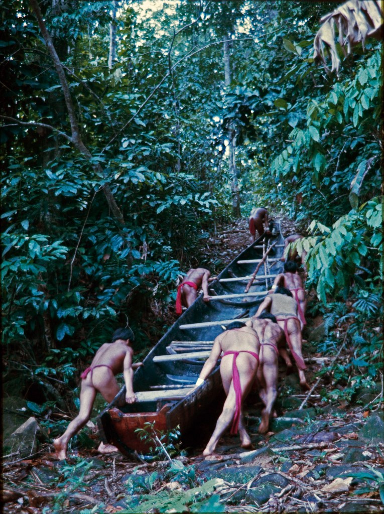 Ye’kwánas transportando una curiara, Salto Para en el río Caura, estado Bolivar.