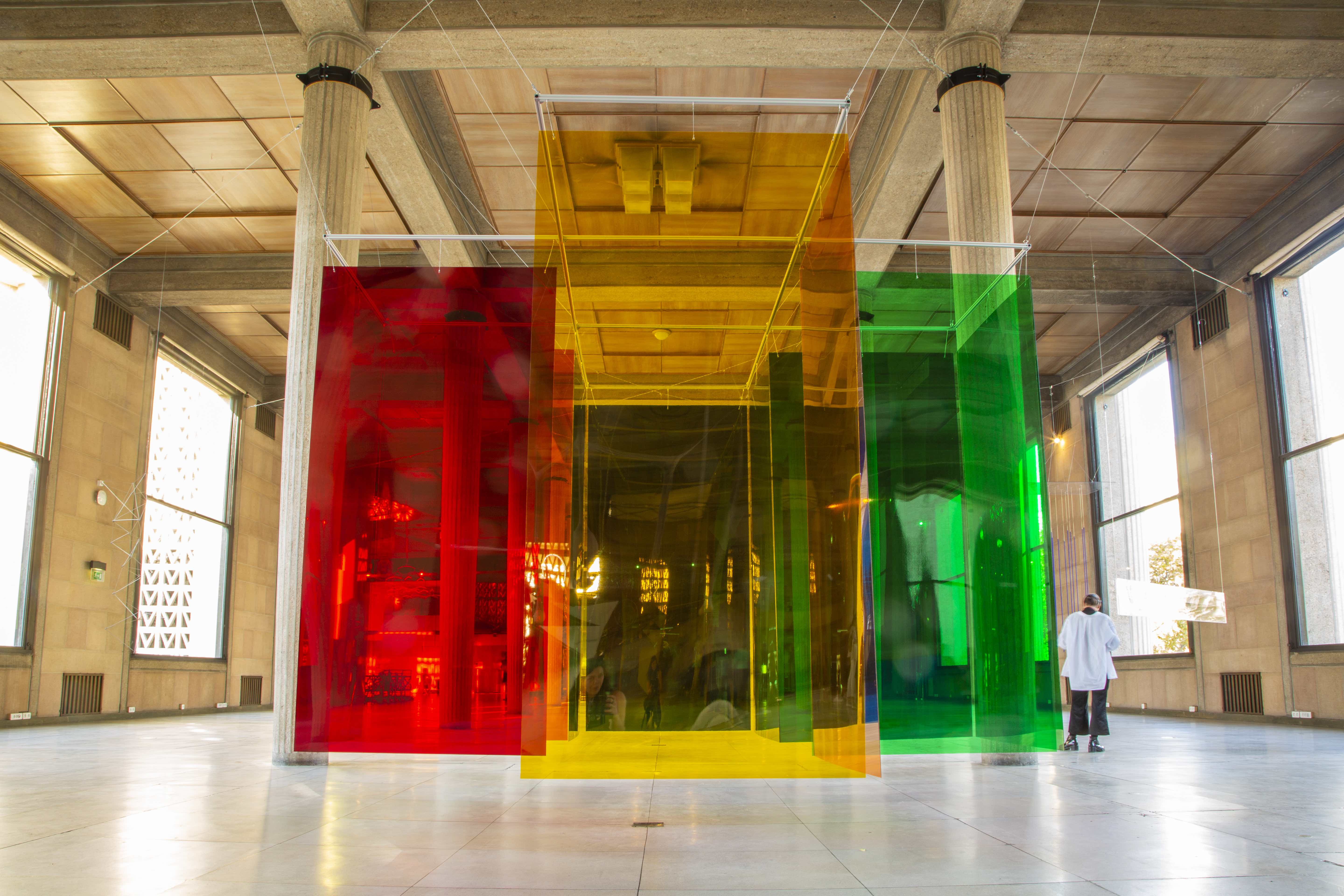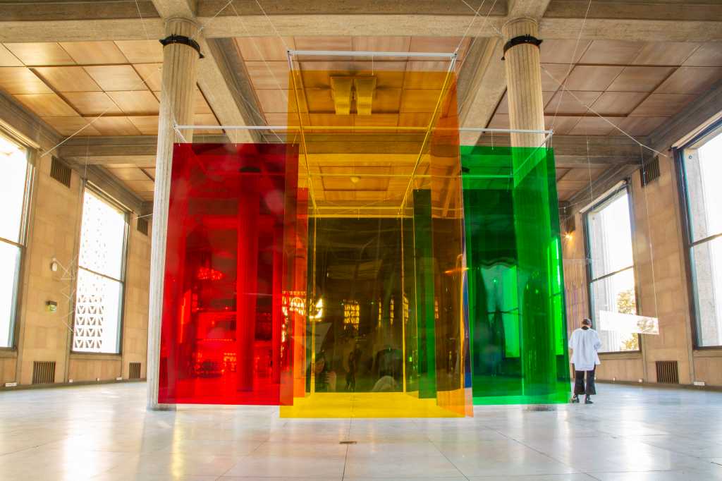 Carlos Cruz-Diez, Labyrinthe de transchromie B 1969 – 2017. Exposition « Suspension. Une histoire aérienne de la sculpture abstraite. 1918-2018 », Palais d’Iéna, París, 2018. © Carlos Cruz-Diez / Bridgeman Images 2024.