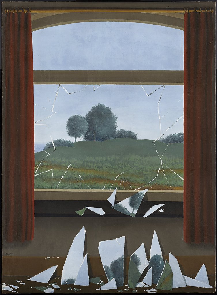 Al leer a Leandro Area, recuerdo la certeza con la que Enrique Gracia Trinidad definió el arte de la poesía: “Es oficio de vértigo este asunto de acuchillar palabras al papel”.[2] Area utiliza cuatro piedras de afilar para su cuchillo: Henry Morgan lo sabe (1987), Exceso de presente (1997), La casa extraviada (2000) y Virutario (2017). Los cuatro libros los leí al azar, sin orden cronológico, intentando integrar los fragmentos de una redención que acontece en esas páginas, porque ¿no es acaso su propia redención lo que busca un poeta? Al atisbar en ese umbral muy personal que Area describe al afilar las palabras de cada poema, me doy cuenta de que, en ellos, como en una holografía, el todo está presente en cada trozo. Antes mencioné la palabra atisbo y lo hice en el sentido de conjetura o vislumbre, al acercarme a escudriñar en ese umbral. Leandro Area escribe en un estilo libre de moldes y pretensiones, con una inusitada sinceridad consigo mismo, utilizando un lenguaje pleno de imágenes abstractas, unas veces, conciso y epigramático otras. Esto último me hace recordar a George Steiner cuando afirma que “los lenguajes son ventanas que nos permiten asomarnos a la realidad de una manera única”.[3] Buscando una imagen que me permitiera resumir y mostrar una analogía con sus poemas, tropecé con La Clef des champs de Magritte. Como sucede en esta pintura, Leandro Area abre su ventana para que el lector se asome a su intimidad, eso sí, debe romper el cristal para poder apreciar la belleza poética de lo incongruente.