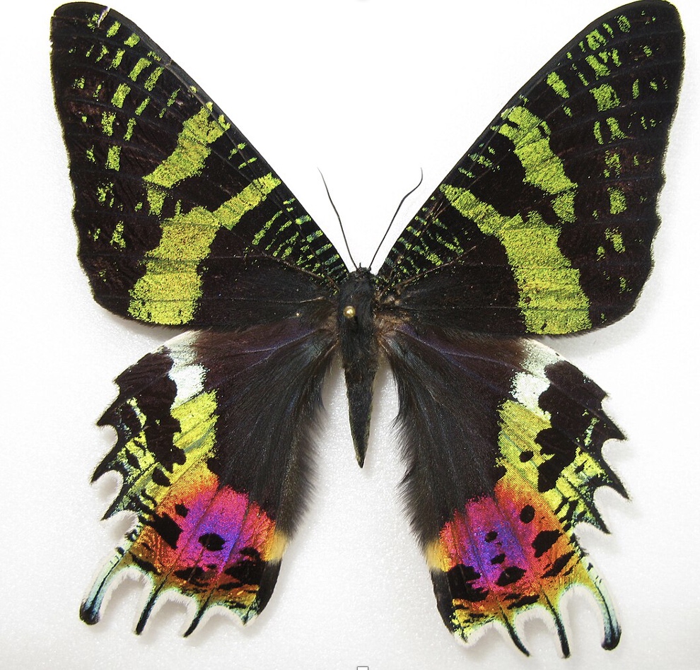 Una de las cualidades chamánicas es la de percibir y comprender el lenguaje de la naturaleza. Entre los fascinantes objetos que componen dicha muestra, observé en un enmarcado de taxidermia, la colorida Uranie (Chrysidiria rhipheus), una de las más vistosas mariposas del mundo, formando parte de esa colección de objetos rituales, ya que para los chamanes malgaches de Madagascar, es considerada el “alma” de sus ancestros, quienes se presentan en la forma de este lepidóptero para transmitirles, con sus giros danzantes en el aire, mensajes desde otra dimensión, que ellos leen, interpretan y traducen a su pueblo. No es de extrañar su semejanza con la religión griega. La palabra psyche, significaba “alma” y la figura de esta deidad era representada con alas de mariposa. Para los griegos el alma se alejaba volando del cuerpo, como una mariposa de su crisálida.